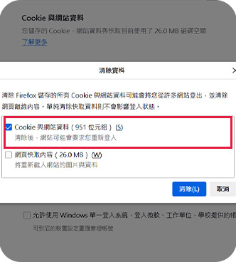 4. 勾選COOKIE與網站資料,再點選[清除]按鈕。