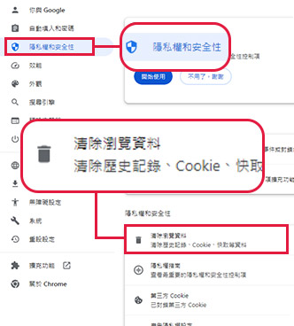 3. 進入[隱私權與安全性] 後,選擇[清除瀏覽資料]。